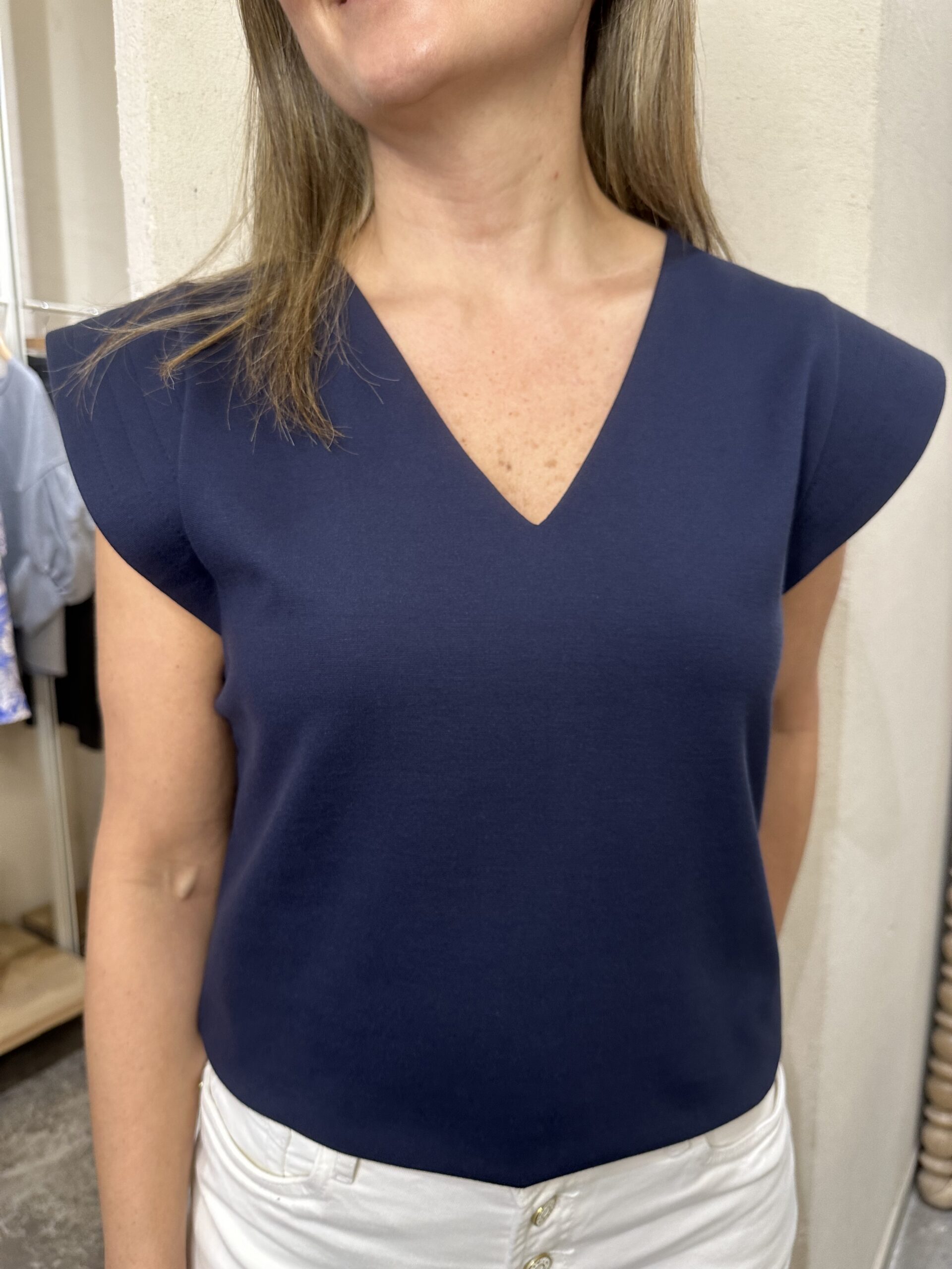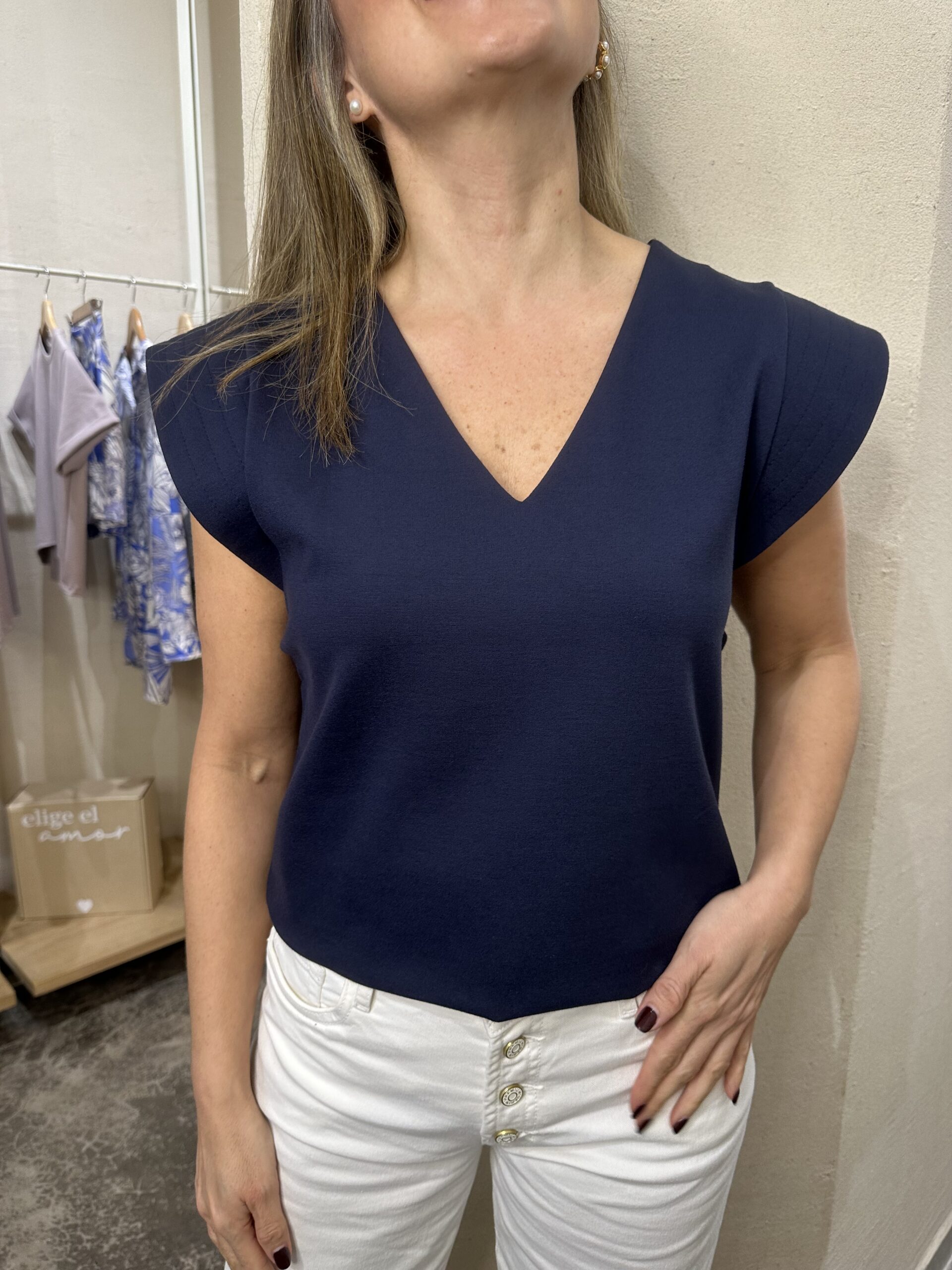 Blusa Lazio Cuello V, sin mangas, con detalles de estructura en los hombros que aportan un toque moderno. Confeccionada en un tejido suave y ligero, es una prenda versátil que se adapta a múltiples estilos y ocasiones.