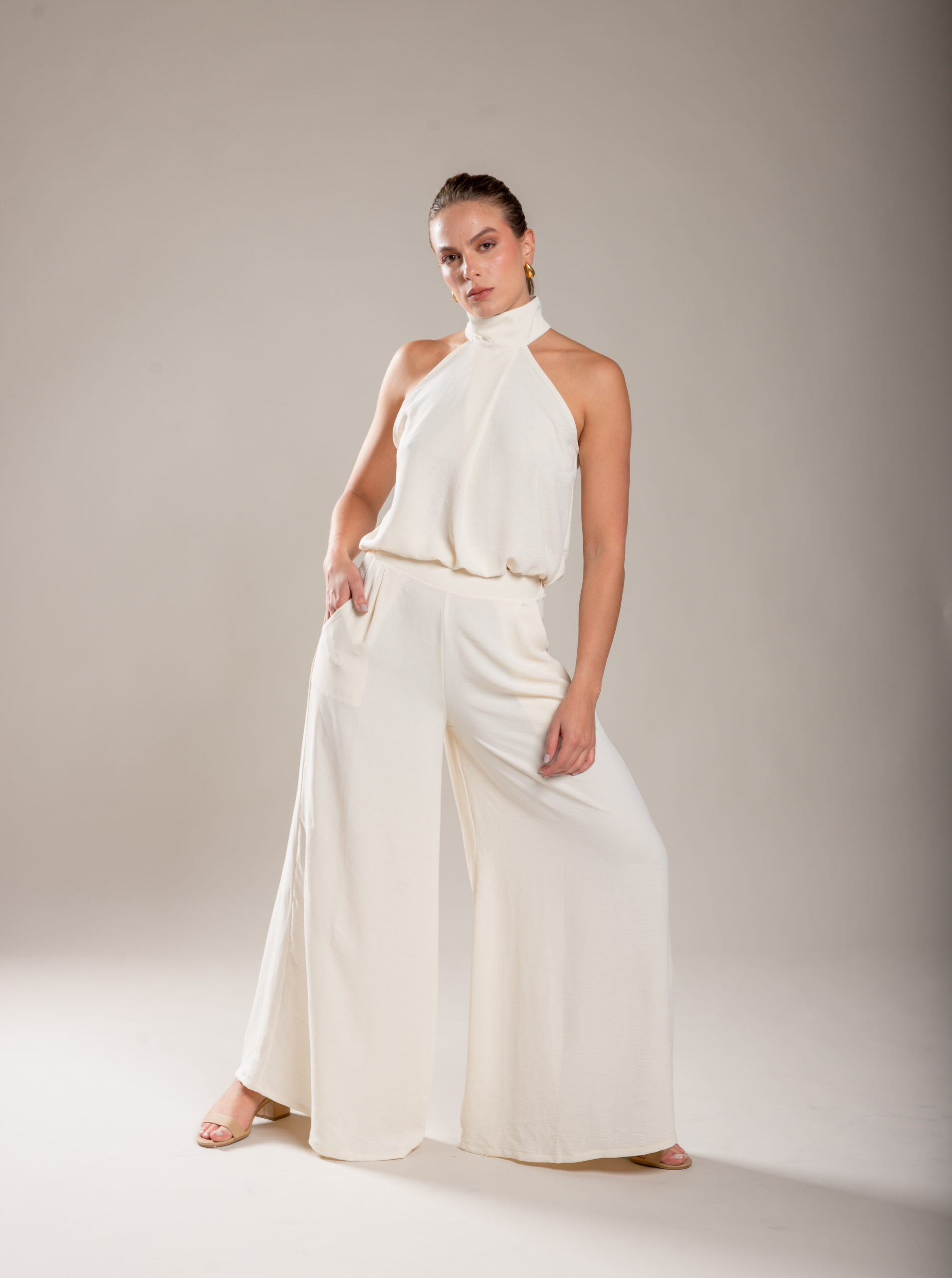 Conjunto elegante de blusa estilo halter con cuello alto y pantalón de pierna ancha. Sofisticación y comodidad en una sola pieza.